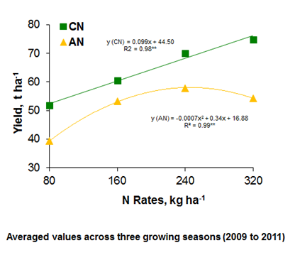 Using the right source, calcium nitrate, increased fruit yield at all nitrogen rates of application when compared to ammonium nitrate. So knowledge of the right source is extremely important to address the needs of citrus and reduce ammonium stress that limits growth and production. With calcium nitrate, a linear increase in yield was observed as the N rate increased compared to the curvilinear response to AN declining yield as the N rate increased. Thus, from the last 3 years of our Brazilian study, we see that 142 lbs. N/a (160 kg. N/ha) applied to mature trees from calcium nitrate produced higher yield than any rate of ammonium nitrate on healthy trees. During the study period, trees were not infected with HLB. Using only nitrate-nitrogen from calcium nitrate as their N source for application, many Florida growers with 100% HLB infection have found their fruit production has increased to pre-HLB levels.