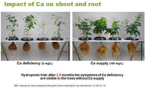 Calcium (Ca) is one of the most important nutrients in a balanced nutritional program for HLB-infected citrus. Cell division or mitosis will not occur without it. Plant cell walls and plasma membranes are weak and limited without Ca resulting in easier access for pathogens and less efficient water and nutrient uptake. Root hair, which are the primary nutrient uptake vessels for plants, require Ca to grow. Below, you will see that Ca is the main driver for root hair development. Also, when water-soluble Ca is removed from growing trees, shoots, leaves and more importantly roots suffer. Healthy roots must be continually grown to replace ineffective HLB infected roots and Ca is a key nutrient for this to occur.