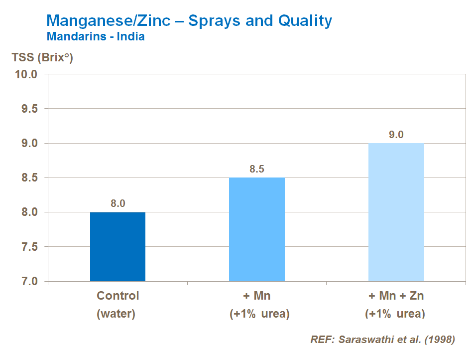 Manganese - often in association with zinc - increases TSS contents of the fruit. It can also help improve the ascorbic acid content of the fruit. As a result, manganese has little influence on the TSS/Acid ratio and this combination of improved sugars and acidity content produces more desirable fruit for the consumer.