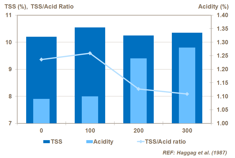 Soil applied magnesium can increase acidity and decrease the TSS/Acid ratio.