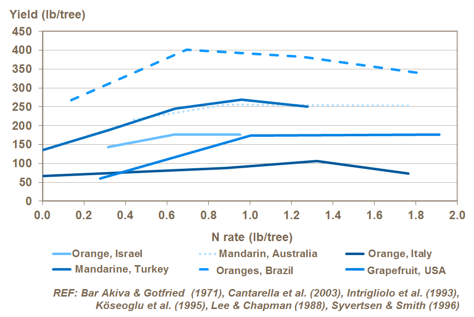 Optimum N-response varies according to citrus tree age. An annual program of fertilizer-N is needed to ensure long-term productivity by replenishing nitrogen, which is removed by harvested fruit. Nitrogen is timed usually in 3-5 roughly equal split applications made during the citrus growing season and during periods of active root and tree/flower/fruit growth and uptake.