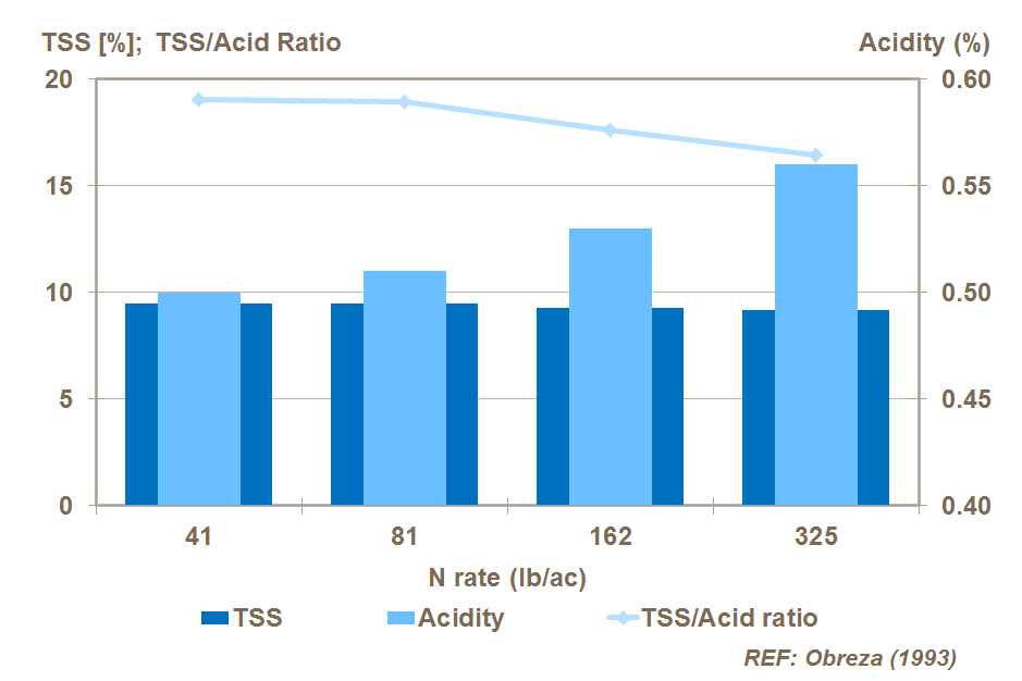 Over-use of nitrogen in an attempt to boost yields can be detrimental to fruit quality. Together with a slight effect on TSS content, high N can also reduce the TSS/Acid ratio. In addition, the ascorbic acid content of the fruit is also lower.