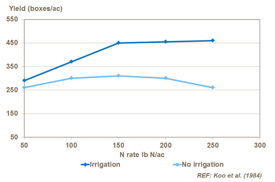 Correct use of irrigation ensures better utilization of nitrogen. Work on Valencia oranges in Florida, shows that an irrigated crop can use more nitrogen, increasing yields.