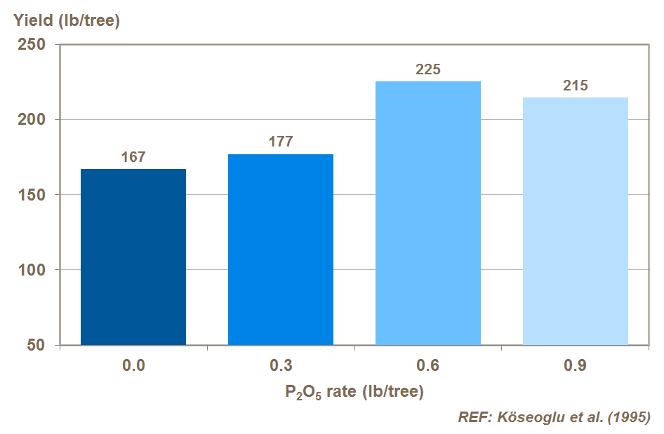 Work on satsumas in Turkey shows that rates of 0.57lb P2O5/tree provided optimum yields over a four year period. For mature trees, application timing is not critical. Fertilizer is usually applied at the beginning or the end of season. Regular application by fertigation can increase efficiency of P-uptake and ensure good utilization of other nutrients at the same time.