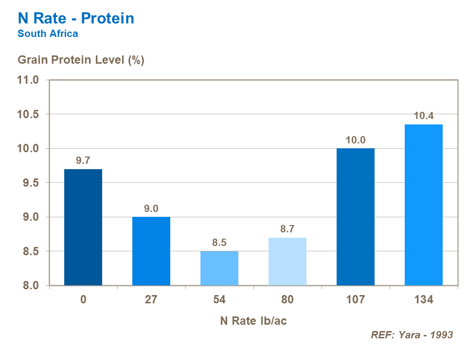 Poor nitrogen supply during grain fill leads to lower grain proteins. A balanced nitrogen topdressing during stem elongation can improve grain protein content and provide the right amount of nitrogen to sustain the grain corn filling.