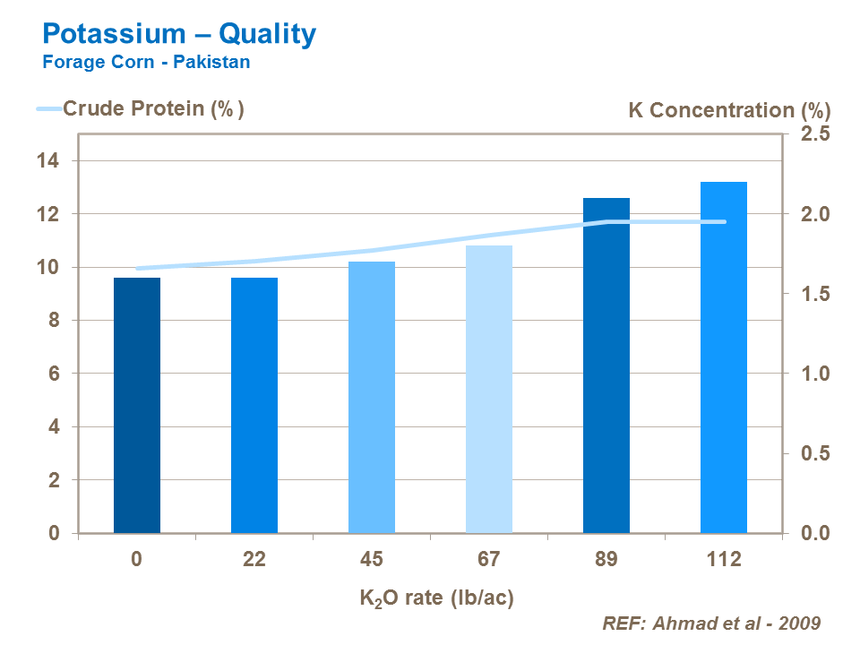 Potassium nutrition increases crude protein content of forage corn. There is evidence that boron increases the starch content of forage corn, increasing forage corn energy.