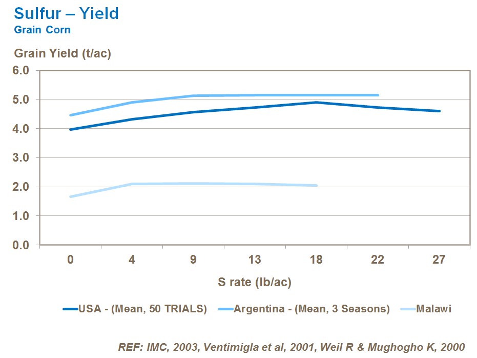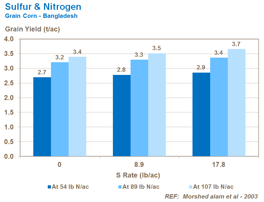 The following trials demonstrate the effects of sulfur and nitrogen on grain corn yield.