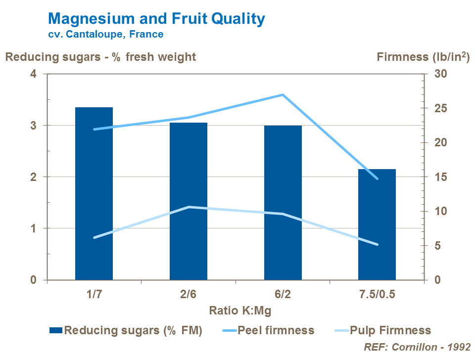 Magnesium uptake however, can be depressed by an excess of other cations (potassium, ammonium and calcium) so it is important to maintain a correct balance to avoid compromising uptake. An imbalance of cations will lower peel firmness. Magnesium – in balance with potassium and calcium – ensures good pulp firmness.