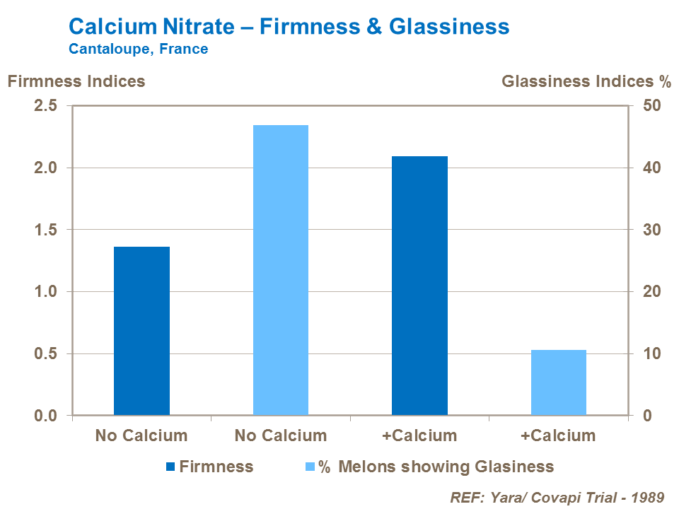 Lack of melon firmness can be a result of poor calcium nutrition. High levels of calcium thicken cell walls and firm the fruit. However, calcium needs to be balanced with adequate supplies of boron to prevent cracking. Trials confirm that calcium nitrate is particularly effective at ensuring good fruit quality.