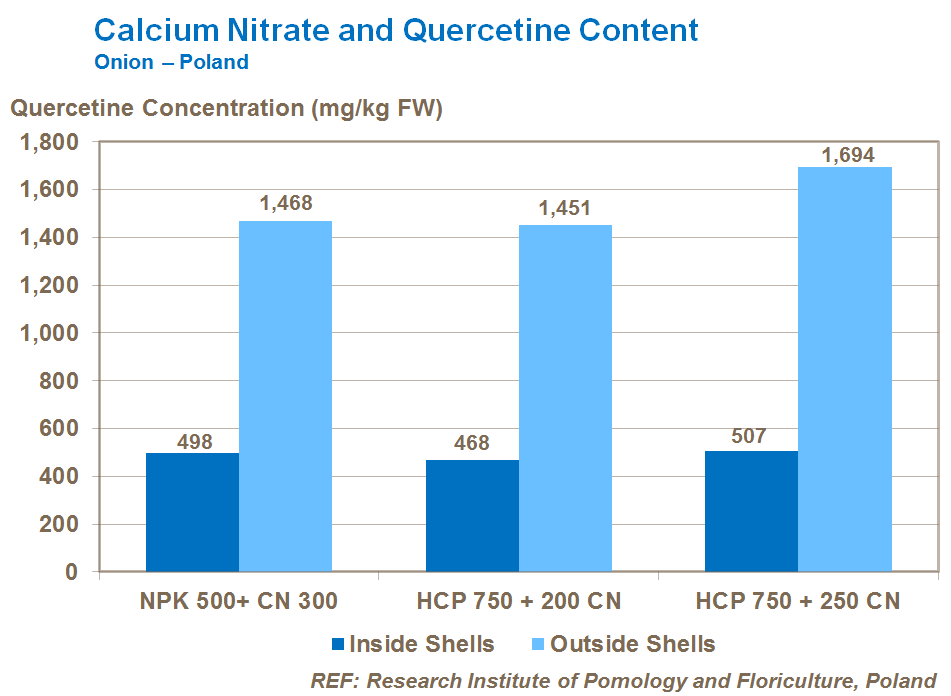 Research shows that good nutrition with calcium nitrate will also increase quercetine concentrations within onion bulbs. Quercetine is a yellow pigment that improves the color intensity of the skin and the storage properties of the onion. It is an antioxidant and helps improve human health through decreasing cholesterol levels, controlling blood pressure and increasing tolerance to certain allergens. Calcium deficiency leads to onion bulbs with low density and reduced quality, and with softer skins.
