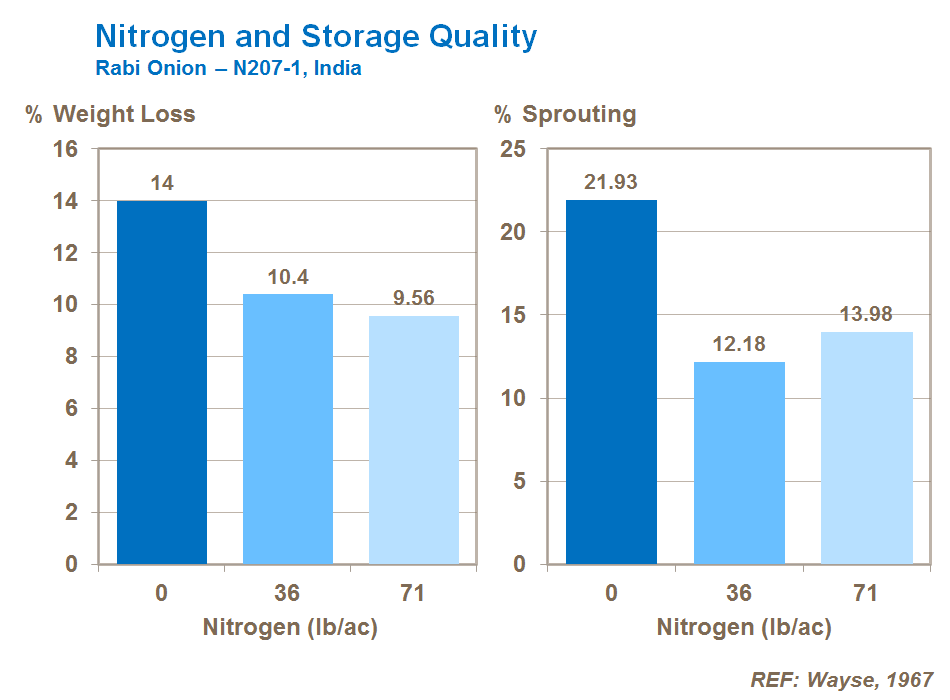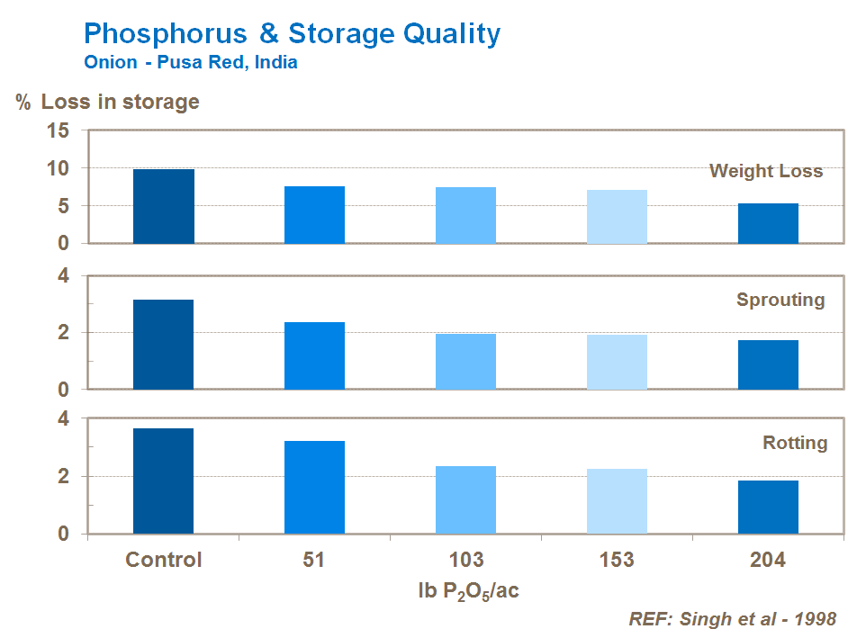 Phosphorus has a positive effect on storage quality of onions, especially when high rates of nitrogen have been used. Where phosphorus supply is adequate, there is lower weight loss, less sprouting and reduced rot.