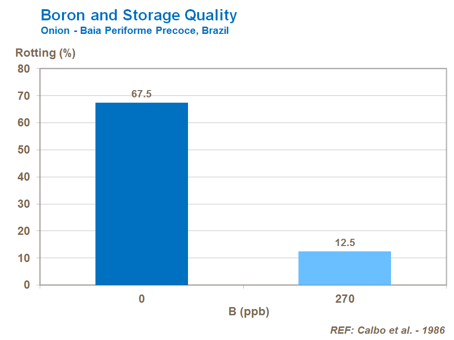Trials confirm Boron's effects on yield and also on improving storage quality. The effect of boron on storage quality could be associated with the micronutrient’s role in improving calcium accumulation in the bulb.