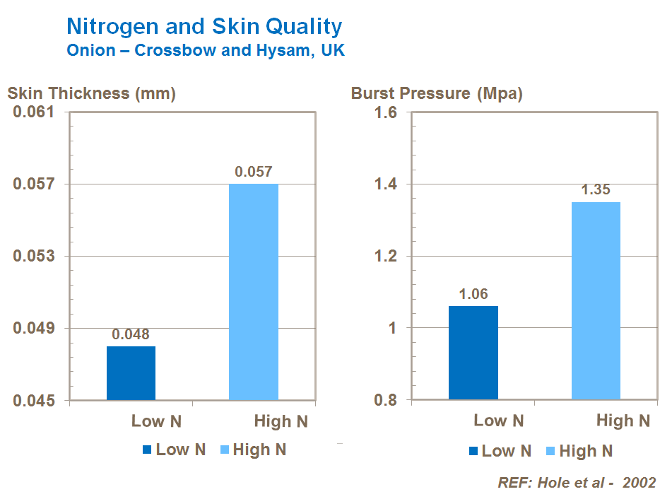 Onions with the correct amount of nitrogen to support strong and fast leaf growth and early bulb formation have better storage quality as they suffer less from weight loss and sprouting.