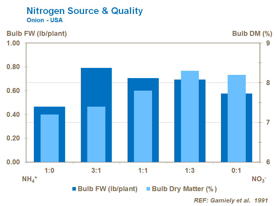 Trials confirm that a balance between nitrate and ammonium-N is most effective at promoting onion leaf and bulb growth. However, during later stages of growth, nitrate forms provide higher dry matters in the bulb.