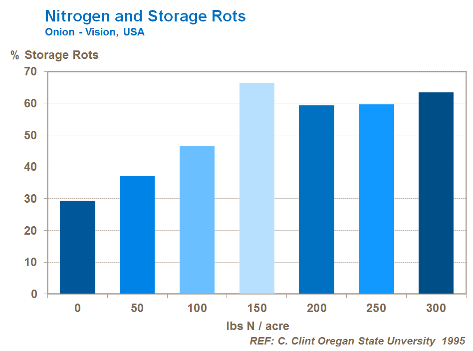 Later applications of nitrogen are the main cause of increased incidence of thick necks and rot in storage as well as for delayed maturity.