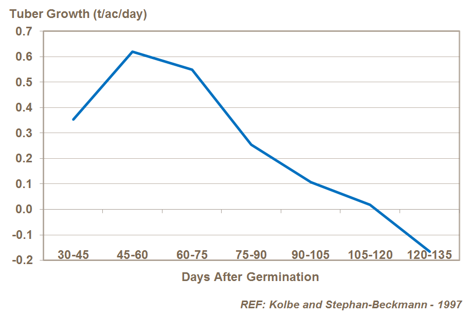 Low nitrogen and high sucrose levels in the plant favor the formation of more tubers. Once formed, tubers grow rapidly, reaching a maximum rate of up to 1,250 lb/ac/day in temperate climates. Late varieties seem to be more sensitive to long day lengths or high temperature conditions.