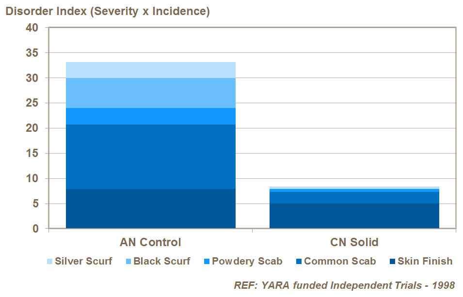 Calcium also reduces the level of tuber skin diseases including black scurf and powdery scab leading to better skin finish. But high levels of free calcium in the soil, e.g. from recently applied lime, may increase the level of common scab (UK trials).