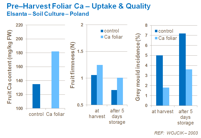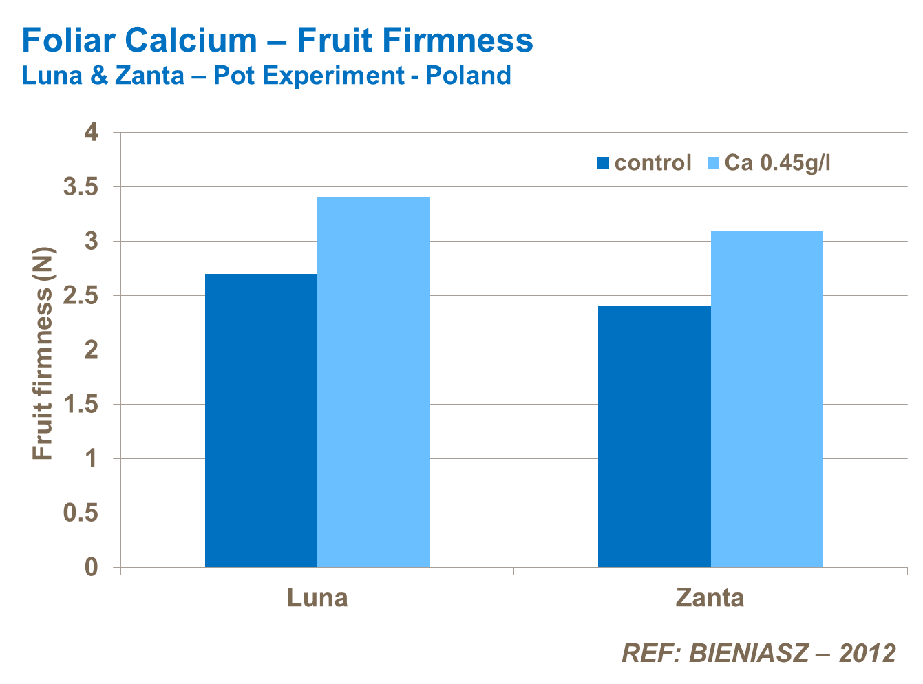 However, excessive rates of calcium at the expense of other cations can reduce fruit firmness and shelf life. For this reason it is important to keep calcium applications in balance with other cations such as potassium and magnesium.