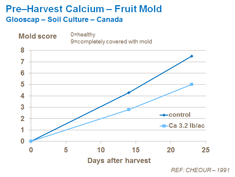 Calcium also helps to reduce levels of mold on fruit post-harvest. This calcium can also be applied pre-harvest as a foliar application. Ca reduces albinism, maintaining fruit coloration through increasing anthocyanin levels during maturity.