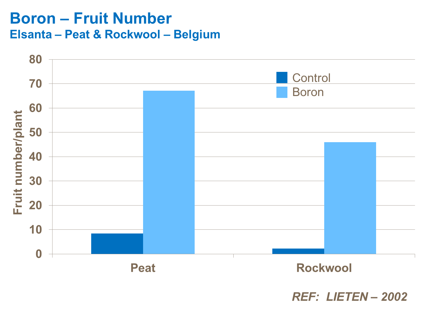Strawberries are very sensitive to salinity. All irrigation water contains dissolved mineral salts. Calcium can help mitigating salinity effects. Boron improves calcium distribution in new tissues.