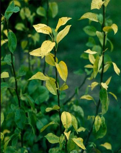 Symptoms always start at youngest leaves with yellow green, later lemon yellow and pale yellow interveinal chlorosis. Main veins still remain green.