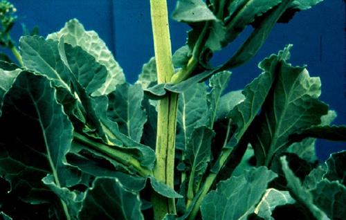 Symptoms of boron deficiency start on the younger part of the plant. The leaves are small, deformed, crinkled and brittle. They show necrotic patches at leaf margin and lamina. Shortened internodes of the shoot lead to a stunted appearance. Splits and hollow lesions occur in stems and truncs.