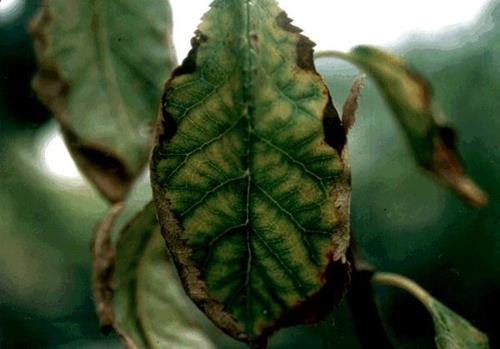 With ongoing deficiency, the leaf margins show dark brown, strictly delimited scorch.