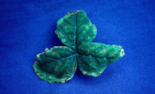 Striking leaf symptoms due to Ca deficiency: drop-like, whitish to bluish spots occur on the leaf blade. Necroses of the same color expand along the leaf margin.