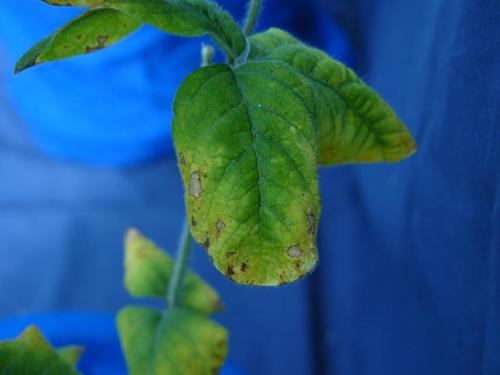 Beginning on older leaves, numerous small brown spots give the plant a mottled appearance.