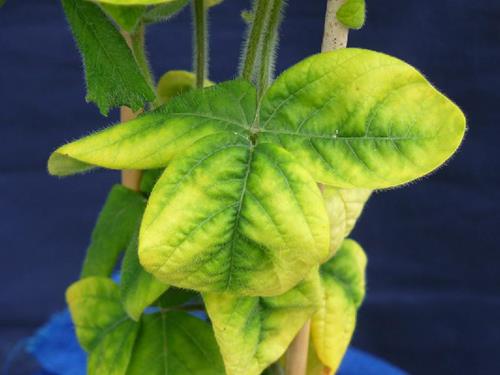 Already far advanced chlorosis. The leaf is almost completely bleached, only the midrib and the adjacent area are still green.