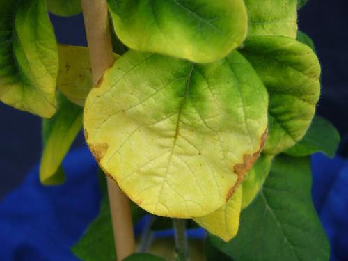 As the yellowing progresses towards the leaf base, there appear brown marginal necroses.