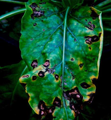 Chlorosis is followed by necrotic spots which appear in the chlorotic zones. The leaf edges blacken and can break away.